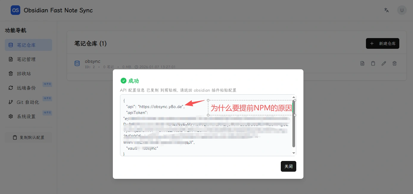 新建仓库,点击 「复制 API 配置」