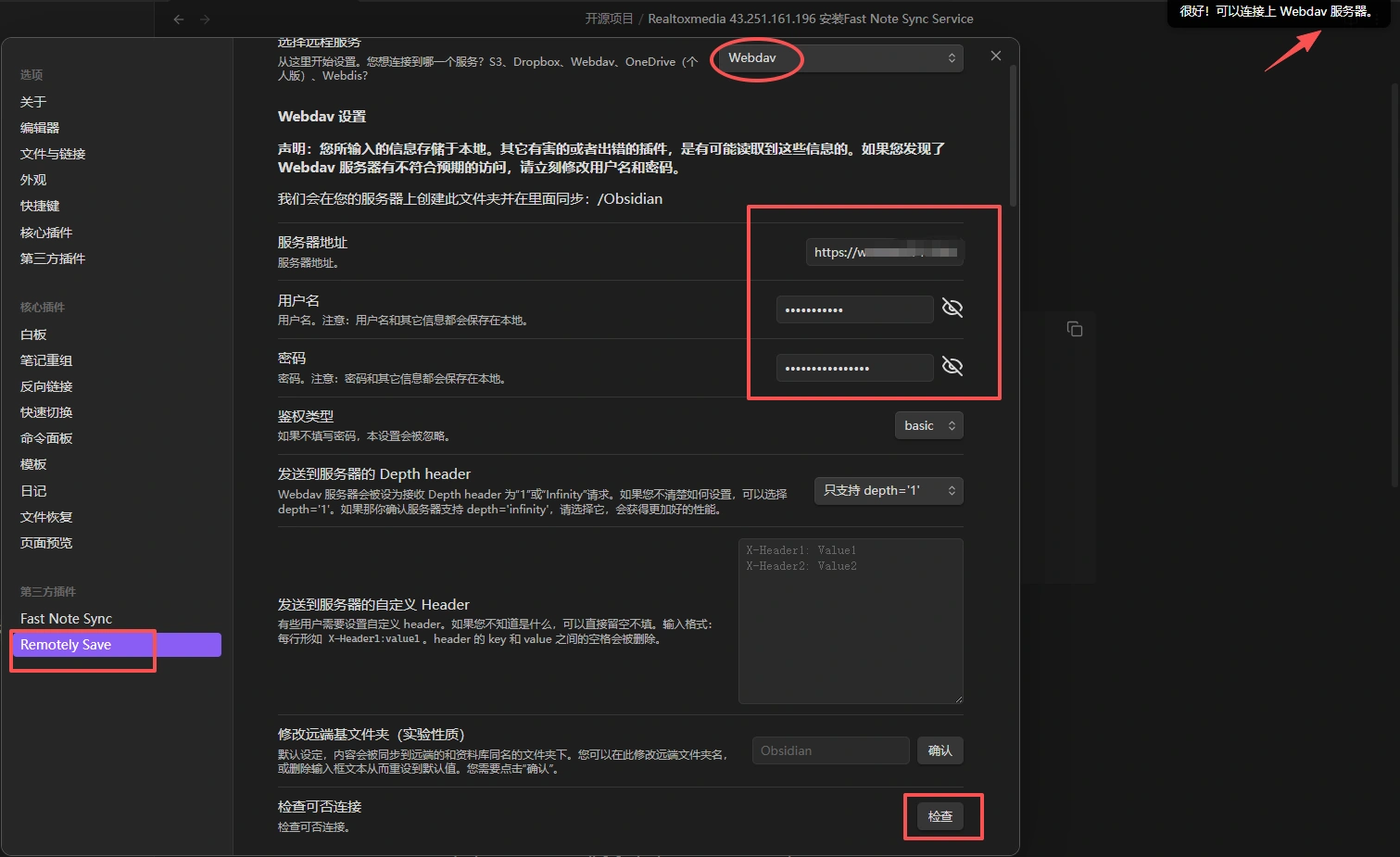Webdav。Server Address: 填入对应方案生成的 URL。