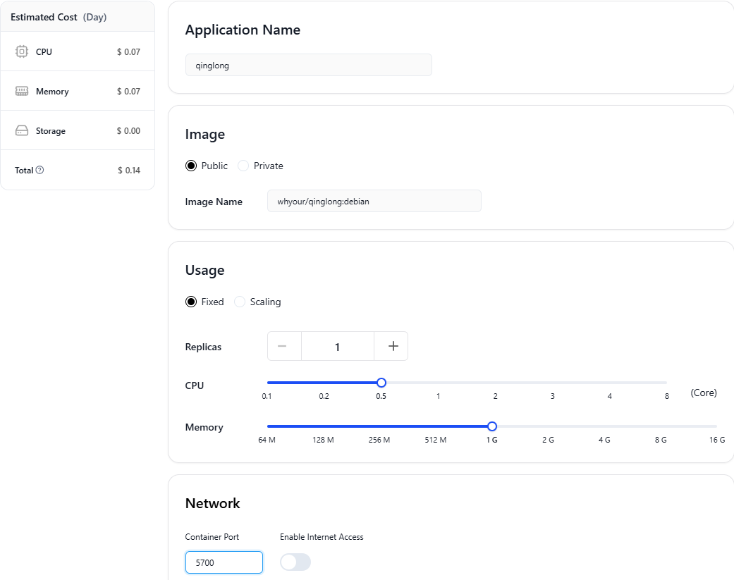 每个月5$免费额度,我选取的配置每天需要0.14$,即每月4.2$,然后免费计划每月最多用10G流量,费用拉满10*0.05 = 0.5$,总共最多花费4.7$。(参考https://docs.run.claw.cloud/clawcloud-run/pricing)