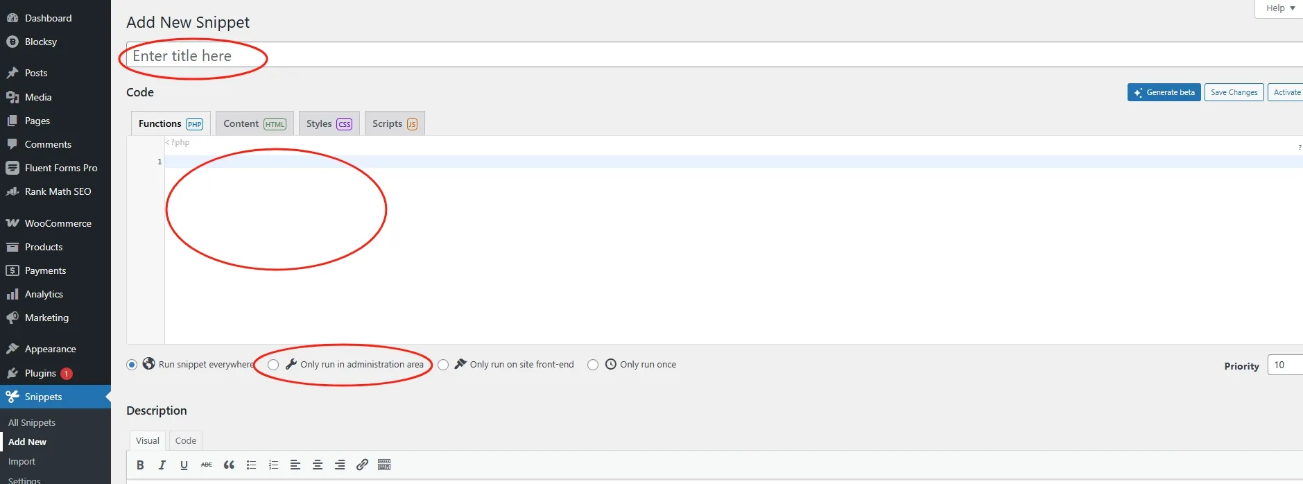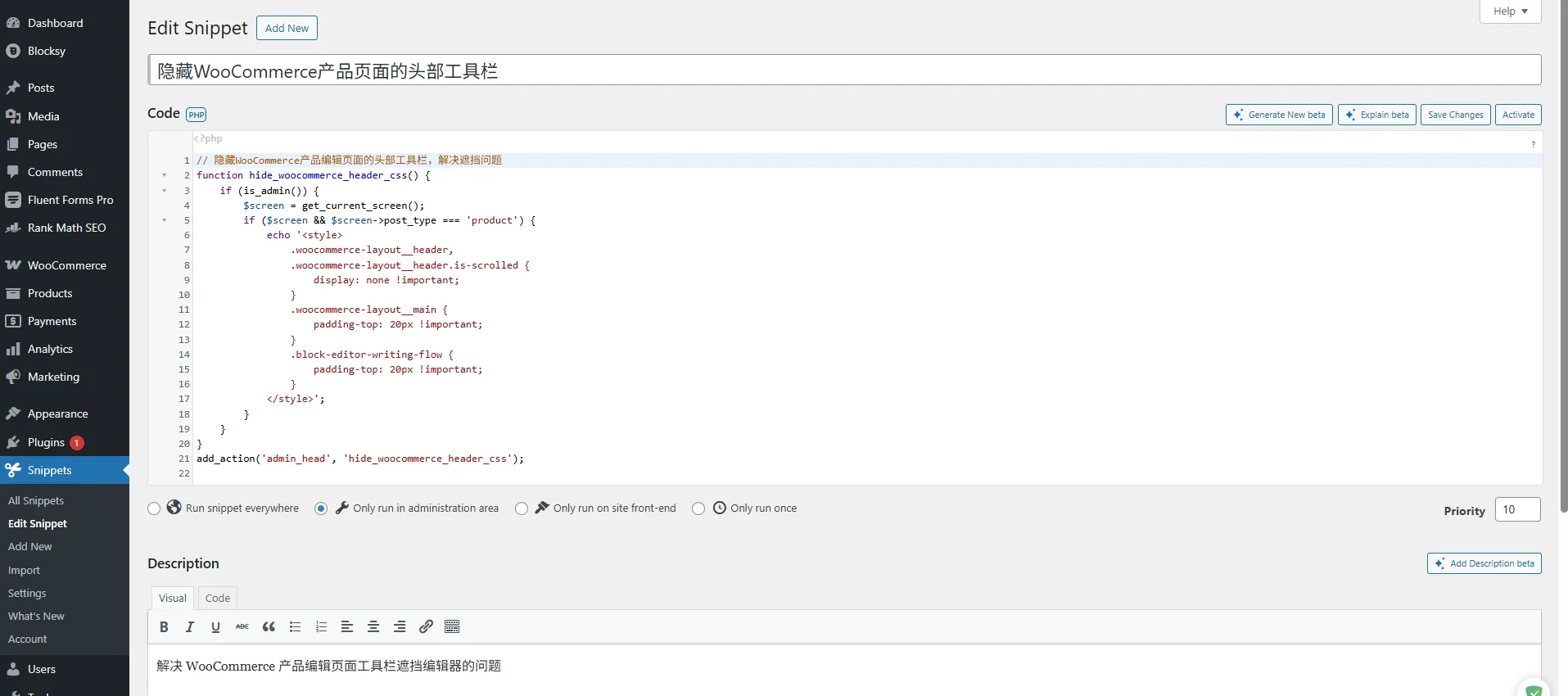 解决WooCommerce产品编辑页面工具栏遮挡编辑器的问题确保"Run snippet everywhere"选项被选中
