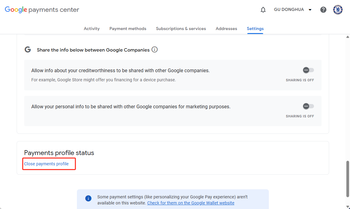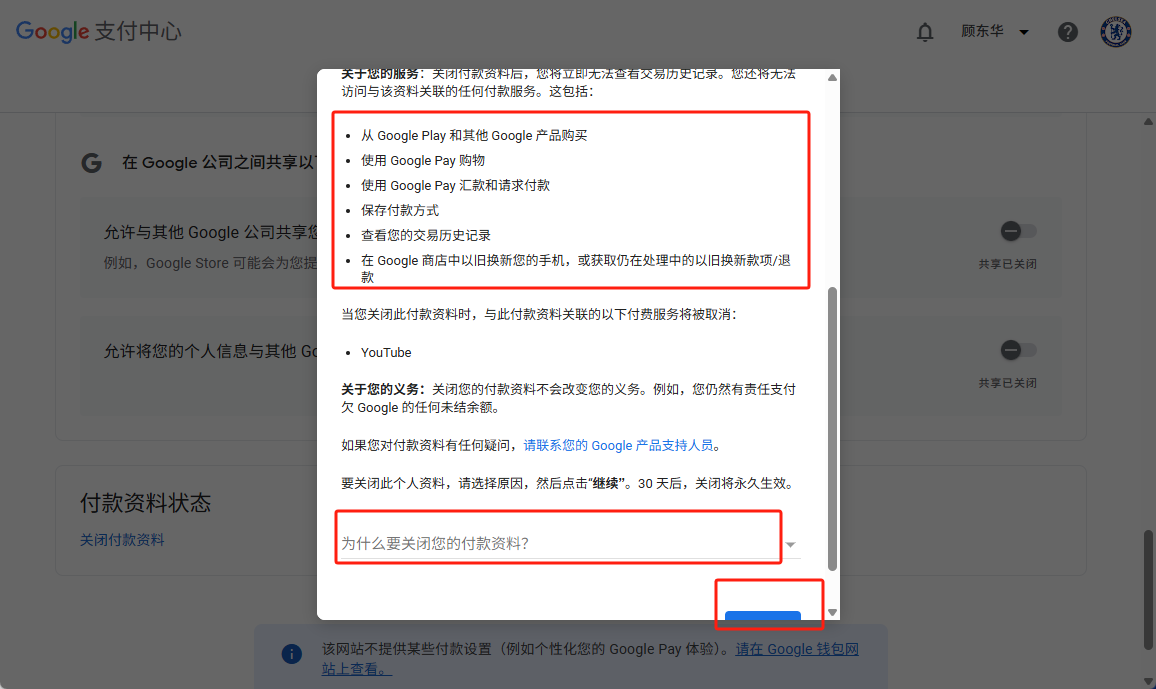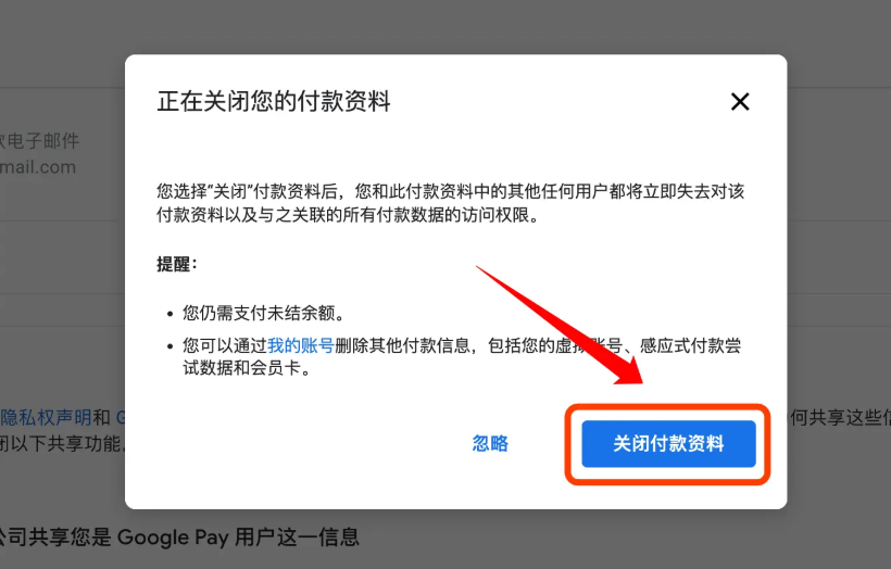 点击付款中心设置页面,选择关闭付款资料(仔细阅读关闭影响,避免损失);