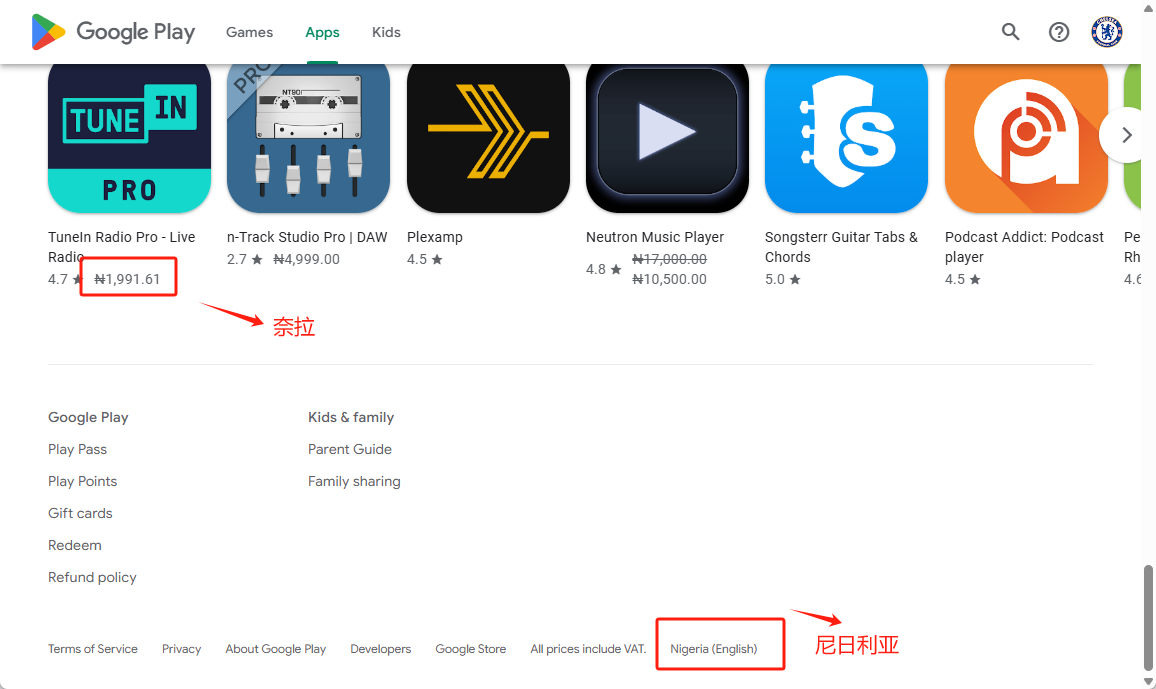 假如当前你正在使用美国节点,Google Play 网页最下方会显示为美国,当你更换尼日利亚节点以后,Google Play 网页最下面的地址显示为尼日利亚