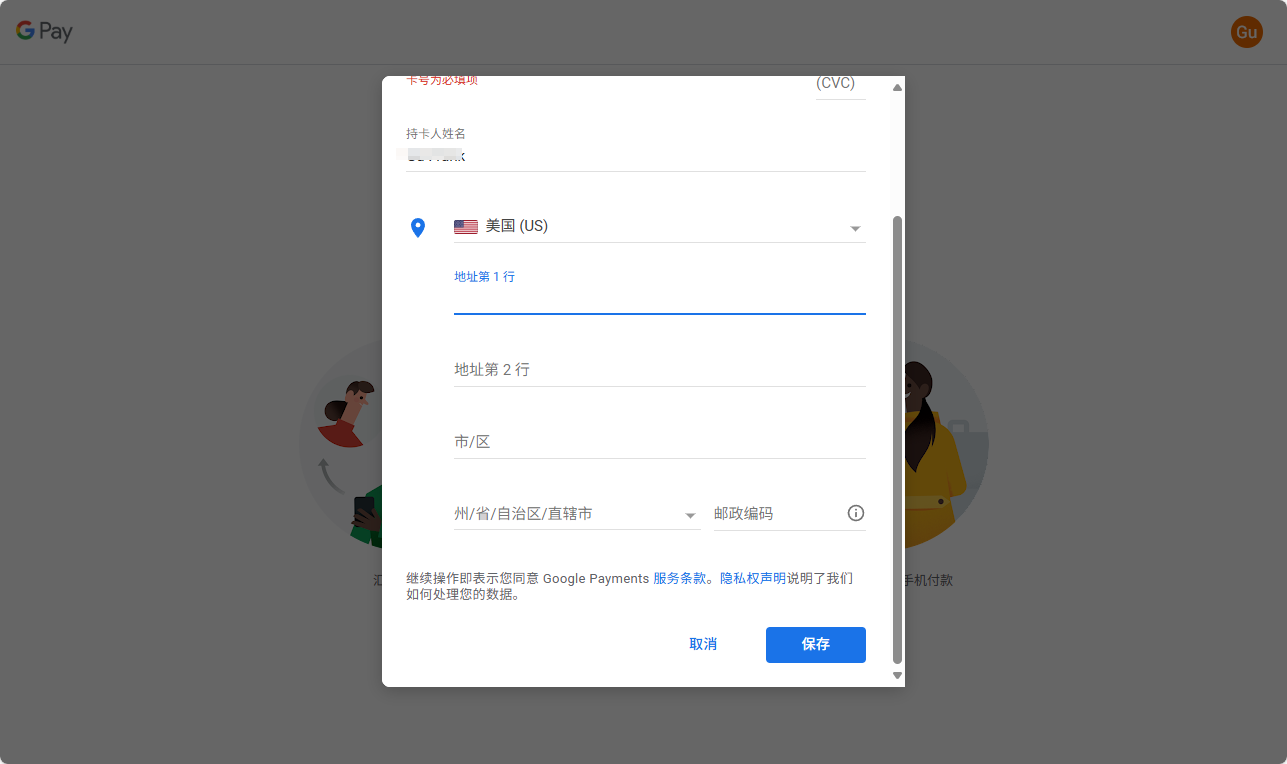 在弹出窗口中,准确输入信用卡信息及对应国家地址等相关信息,点击“保存”。